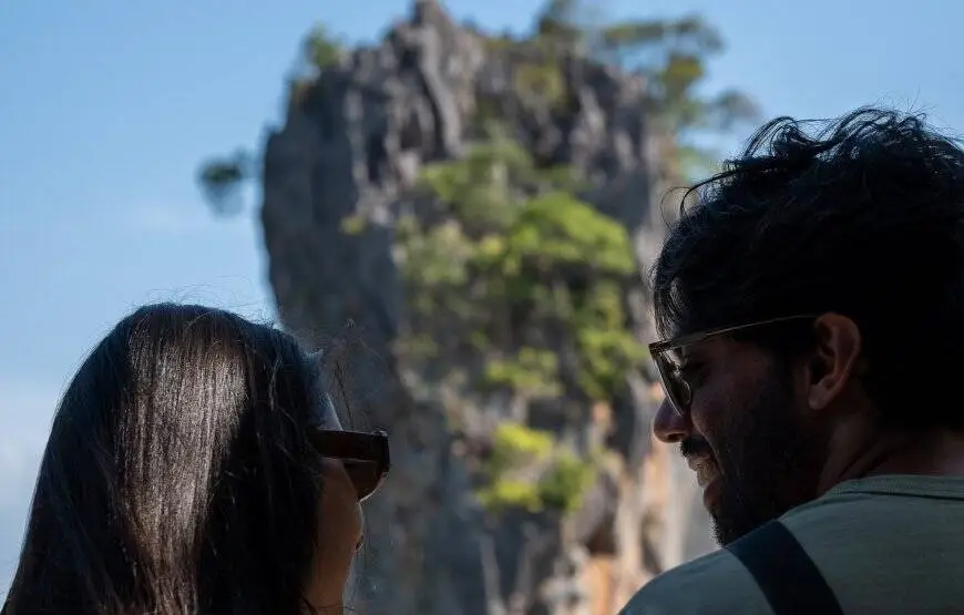 Ko Ta Pu first appears as a slender rock rising from the water as the boat moves through the karst formations of Phang Nga Bay. As you get closer, the shape and texture of the limestone become clearer. While many guests have seen photos before, the first real view often creates an exciting moment on board.
