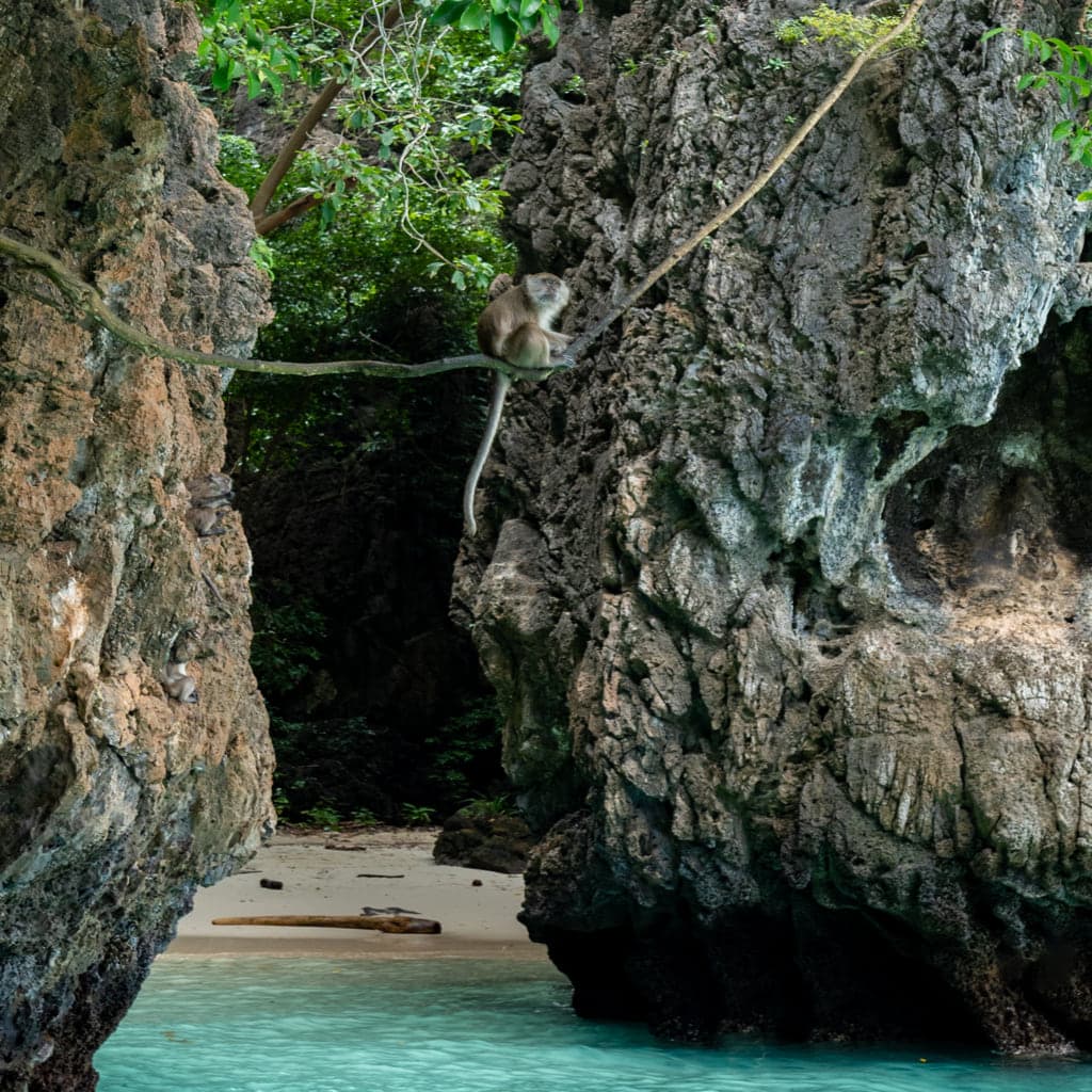 Monkey Beach is a small bay tucked into the eastern side of Phi Phi Don, sheltered by low rock outcrops and fringed by a short stretch of powdery white sand edged with jungle. It looks like dozens of other beautiful bays in the Phi Phi Islands — until you notice the movement along the rocks. A troop of wild long-tailed macaques live here, foraging along the shoreline, watching the passing boats, and carrying on their daily routines with almost complete indifference to human observers.